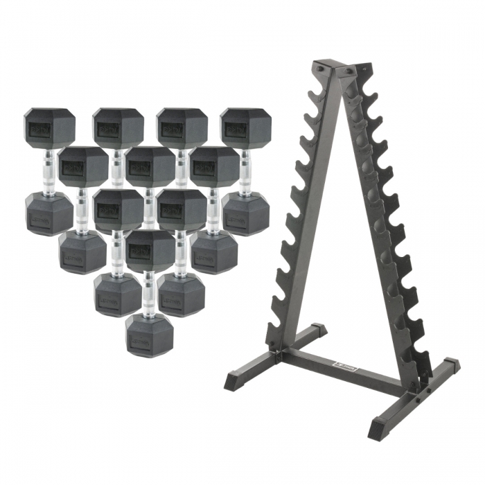 Varför köpa några hantlar när du kan köpa ett helt hantelset + ett hantelställ? Hantelpaket Hexhantlar 1–10 kg med hantelställ är ditt kompletta startkit: ett par av varje vikt från 1 till 10 kg (10 par) och ett praktiskt hantelställ. Hantlarna har gummerad yta och säkert grepp för allt från rehab till rejäla cirkelpass. Enkelt att börja, lätt att skala upp och perfekt för hemmagymmet.