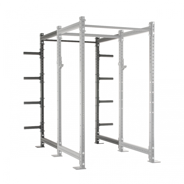 Extension-kitet ger dig en rejäl “bakdel” på racket som gör det enklare att organisera gymmet och hålla vikterna nära, utan att ställa dem på golvet. Konstruktionen är bultad (bolt-together) och byggd i kraftigt stål med en smart hålbild: Westside-hålavstånd i bänk- och clean pull-zonen, tätare hålavstånd ovan och under zonerna, samt glesare hålavstånd på sidorna för tillbehör och justeringar. Förlängningen inkluderar även en pull-up bar med greppdiameter.