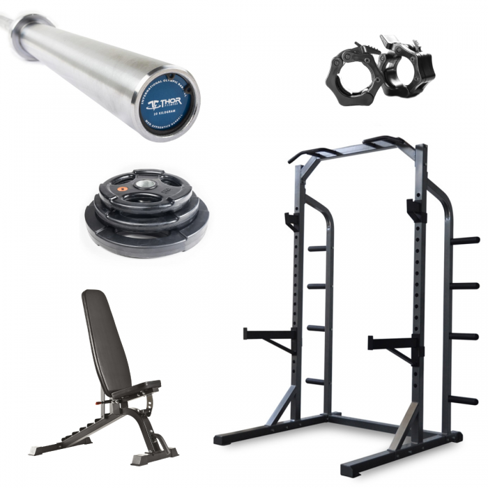 Rack ’n Roll-paketet är ett komplett hemmagym i ett enda klick: half rack, ställbar bänk, olympisk skivstång, lås och viktskivor med handtag. Du får två av varje skiva i flera viktsteg, vilket gör det lätt att lasta jämnt och progressa utan krångel. Perfekt för baslyften och för dig som vill ha en seriös setup som känns kul att använda i varje pass.